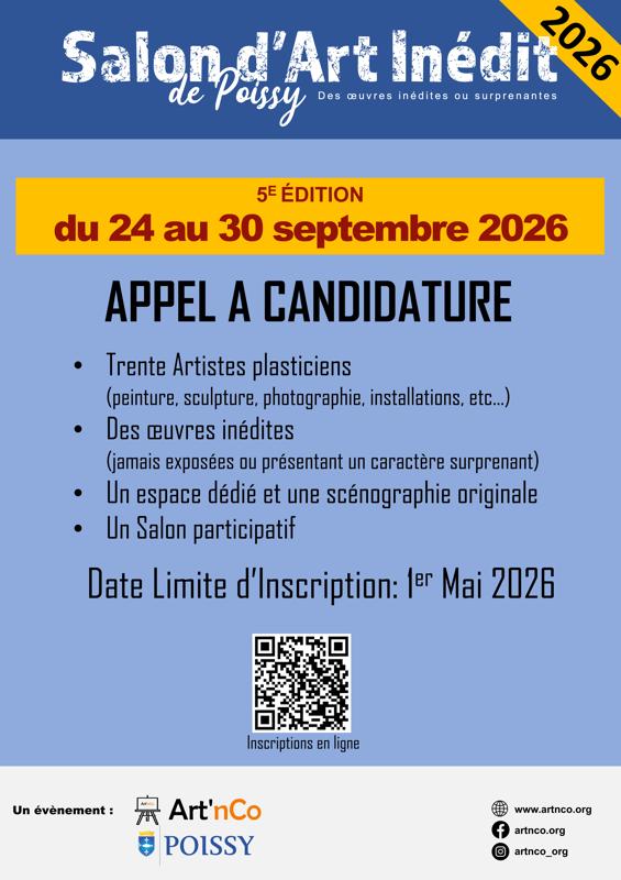 L’Association Art’nCo organise le 5ème Salon d’Art Inédit de Poissy qui accueillera une trentaine d’artistes plasticiens du jeudi 24 septembre au mercredi 30 septembre 2026.