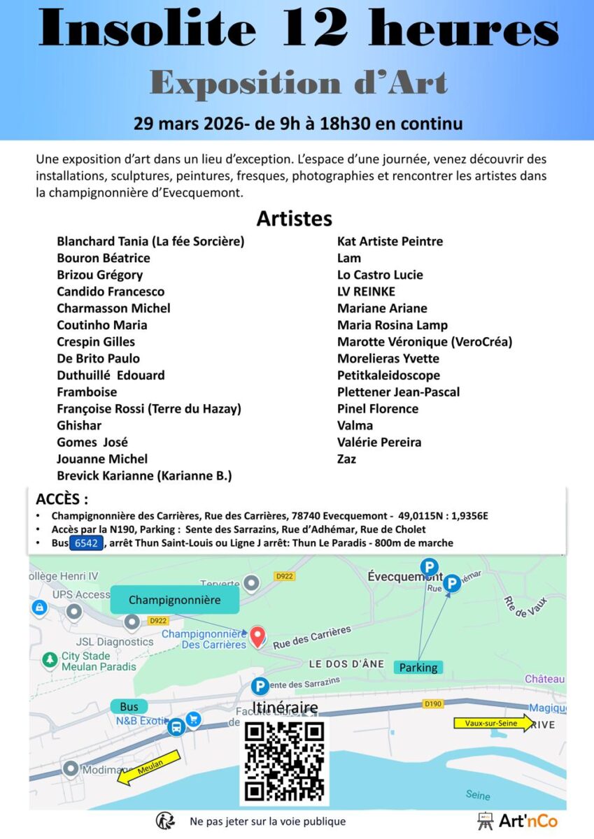 Insolite 12heures revient pour une quatrième édition qui se déroulera du 28 au 29 mars 2026. Cette exposition d’art éphémère, créée et encadrée par Maria Coutinho, bénéficie du soutien de Art’nCo pour la deuxième année consécutive.