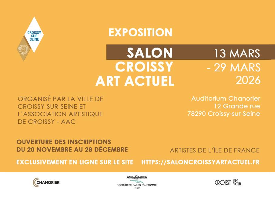Le Salon Croissy Art Actuel 2026 se déroulera du 13 au 29 mars à l’Auditorium Chanorier, 12 Grande Rue, 78290 Croissy-sur-Seine. Les inscriptions seront ouvertes du 20 novembre au 28 décembre 2025 (exclusivement en ligne sur https://saloncroissyartactuel.fr/ )