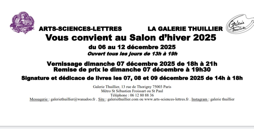 Après avoir obtenu la médaille d’argent par l’ASL (ARTS SCIENCES LETTRES) en octobre, cela me permet d’exposer à la Galerie Thuillier, à Paris, du 6 au 12 décembre. C’est une exposition collective.