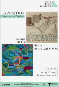 C'est avec grand plaisir que je vous invite à l'exposition Rencontres Textiles, où Tatiana Olea et Sylvie Bourgougnon exposeront Textiles et sculptures. Vernissage le 8 mars à 19h. L'exposition restera …