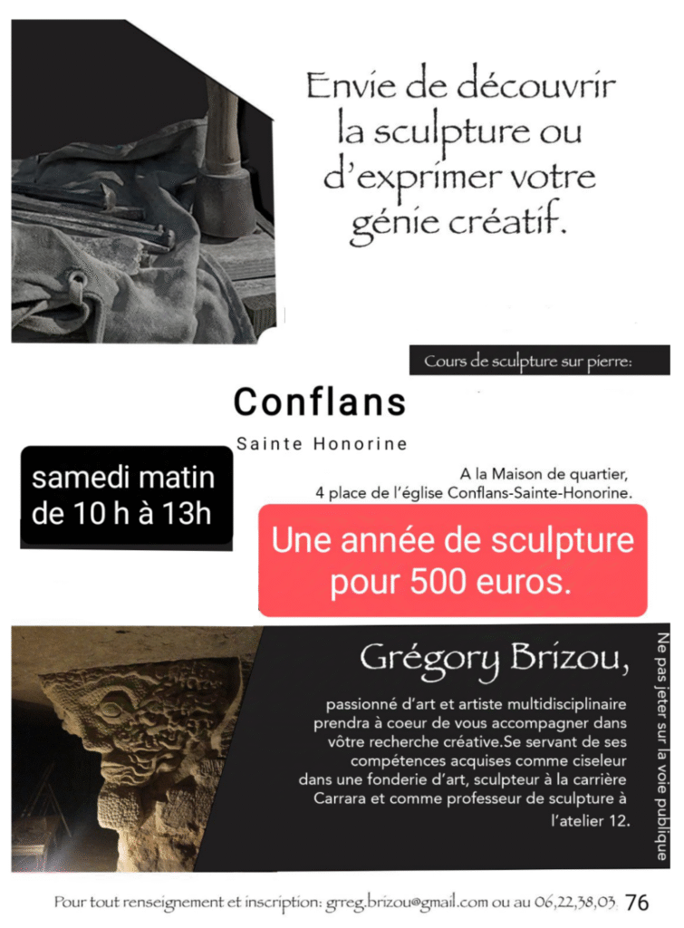 Venez découvrir la sculpture sur pierre, les samedis matin de 10 h à 13h à la maison de quartier place de l'église à Conflans ste Honorine. 500 euros l'année, pierre […]